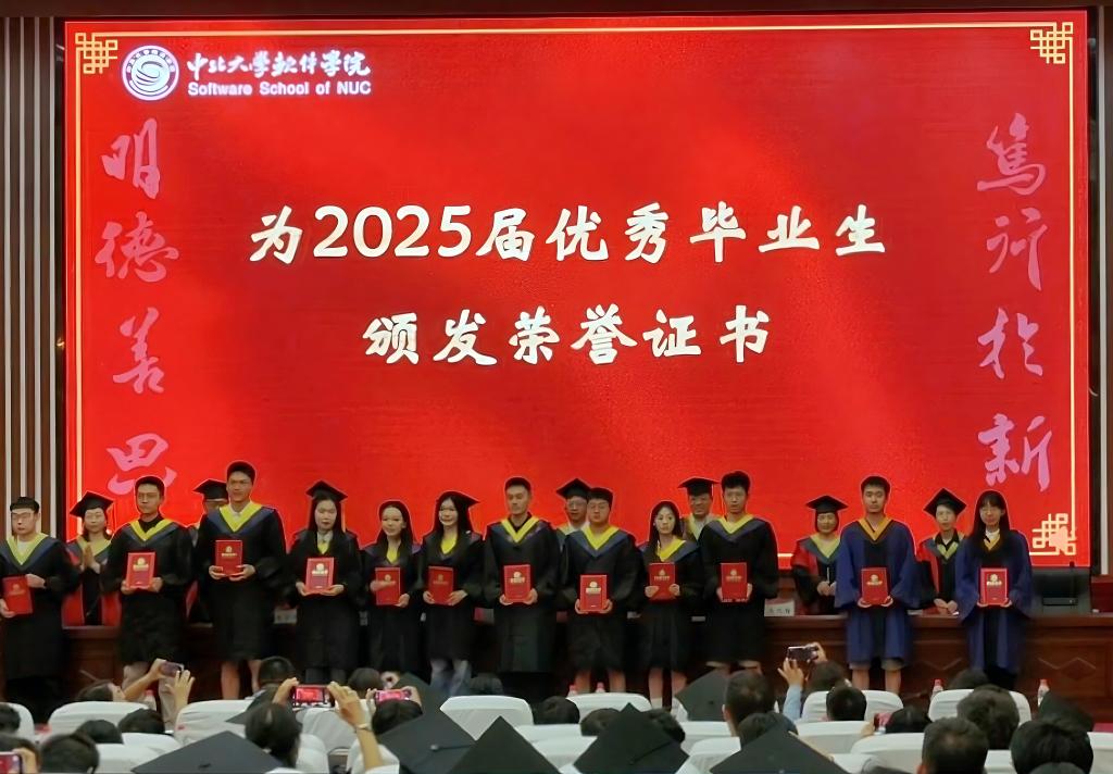副院长李众宣读《2025届优秀毕业生表彰名单》,副院长付东来宣读《毕业生奖学金获得者表彰决定》,参会领导为获奖学生颁发荣誉证书。