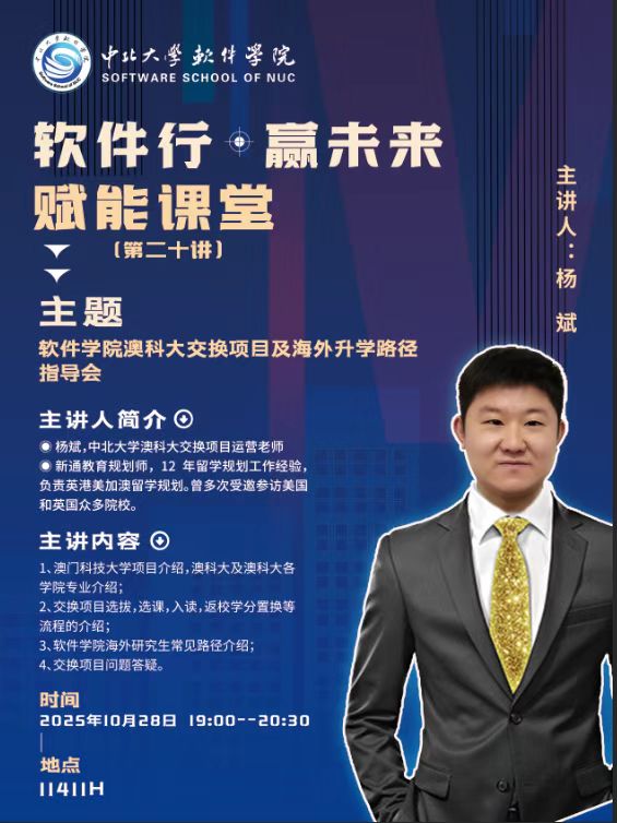 依托“软件行·赢未来”赋能课堂品牌,于10月28日晚在11411H教室成功举办了澳门科技大学交换项目宣讲暨海外升学路径指导会,吸引了博彩新闻